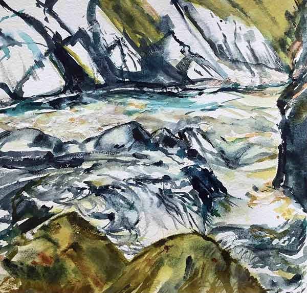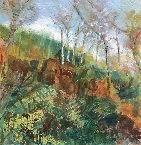 I have always enjoyed drawing outdoors and translating my sketches into paintings. I fell in love with the medium of batik during my teacher training and for many years focused on this alongside teaching. I then began to diversify, experimenting with mixed media that included machine stitch and eco print. I currently work mostly in watercolour, sometimes adding collage or print to the surface.