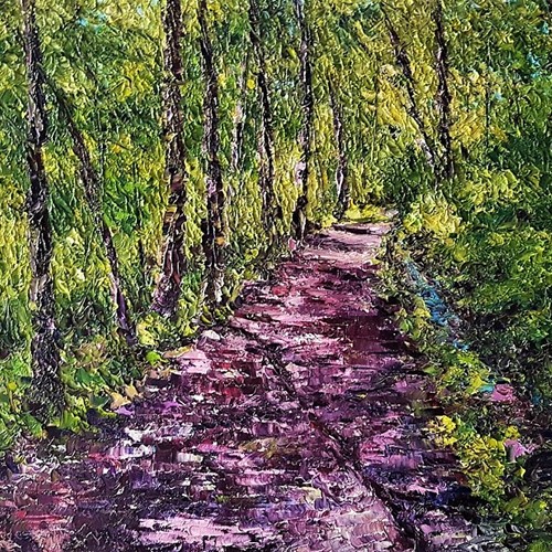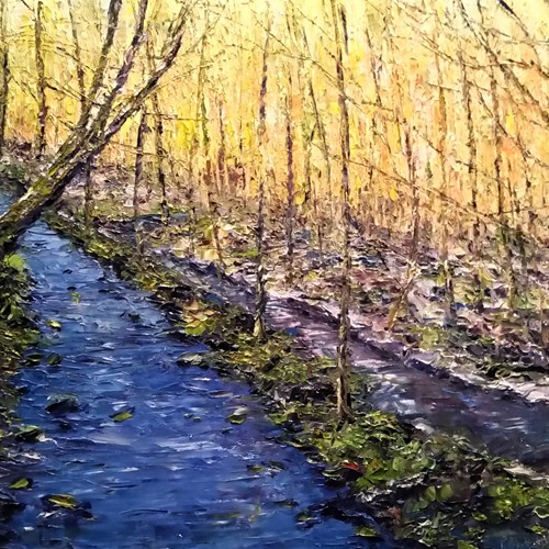 My landscapes are fragmented. As natural sunlight filters through the branches, the images highlighted are the colours and shapes of nature. I hope, using texture, I have captured the depth that can be found in woodland scenes.