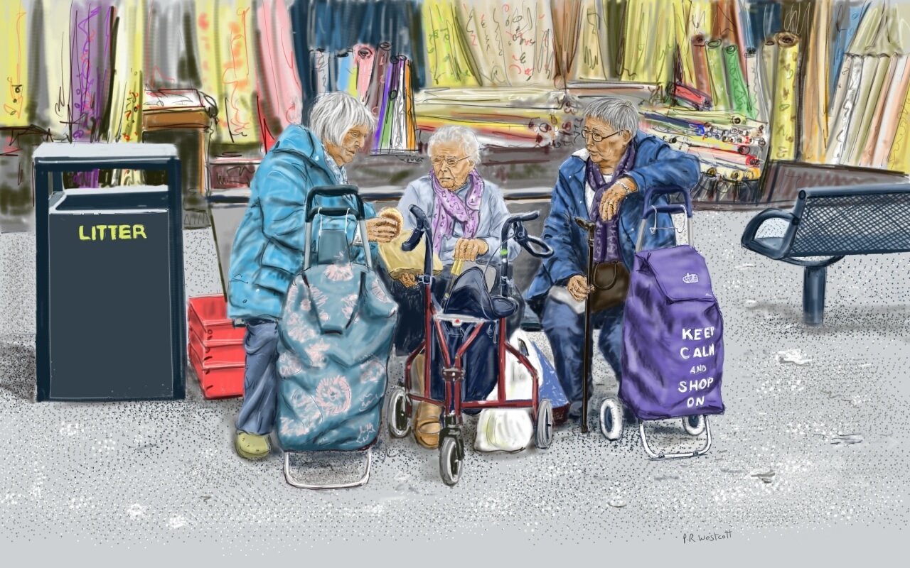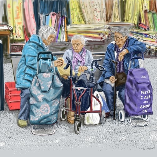 In these compositions I capture indiscriminate figures by painting them loosely so that they appear to merge into the scene. I often highlight them with fleeting glimpses of colour, to give the impression of a fast-paced lifestyle. Concentrating on the busy shopping centres depicts the hustle and bustle of modern life.