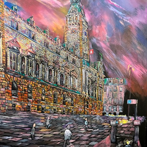 This painting has depth, energy and movement to the composition. The judges really liked he subject matter, the surface treatment and the colour palette especially the blue of the sky.