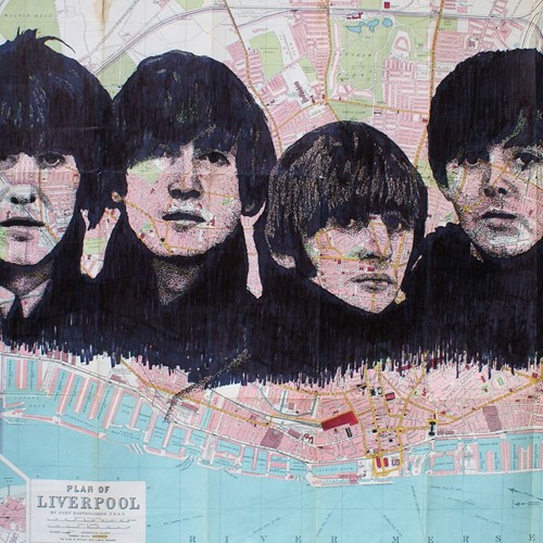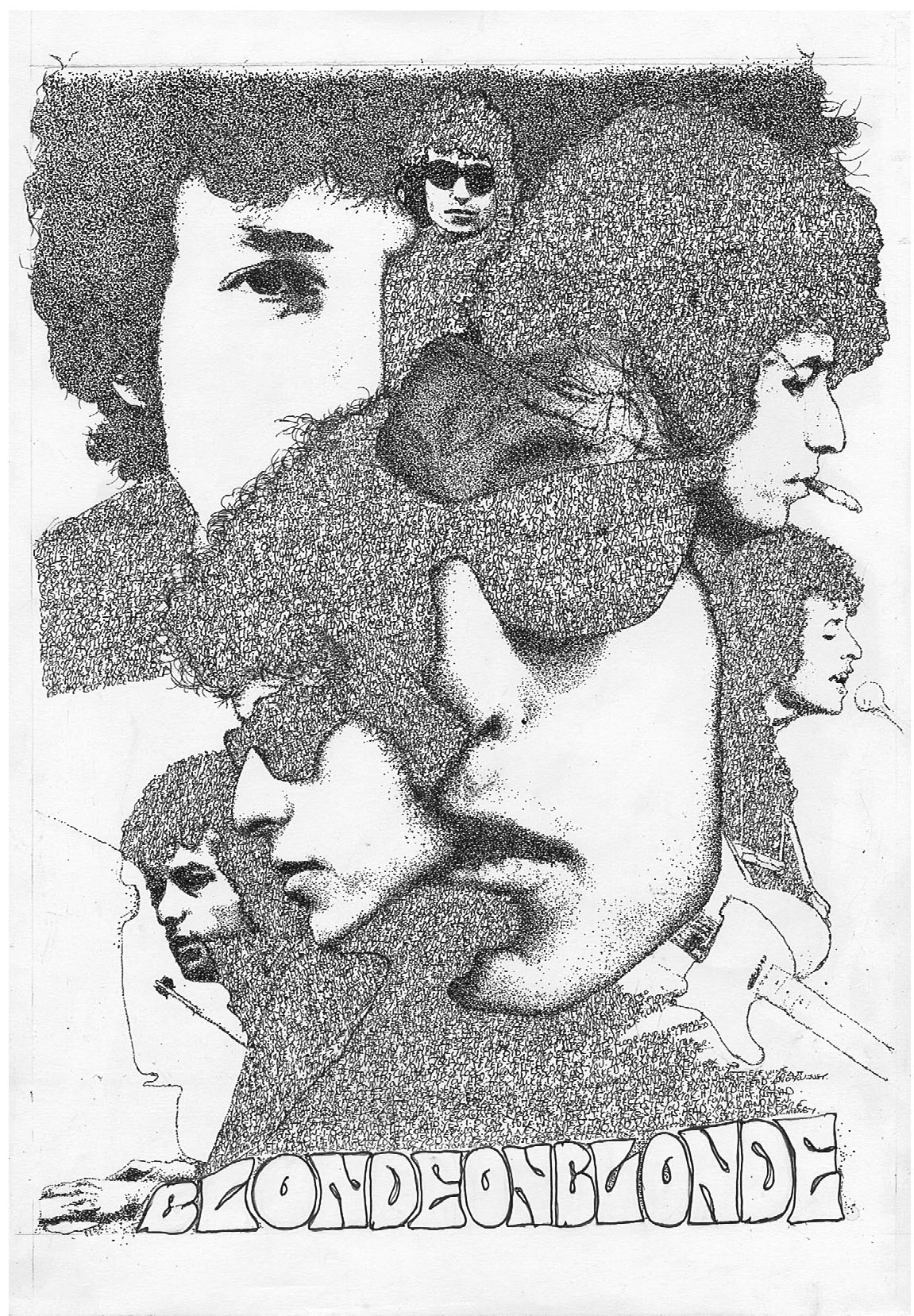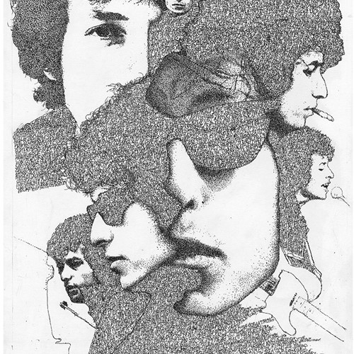….many of the drawings employ a stippling technique using numerous small dots, while some works incorporate song lyrics, providing depth and tone to the montage of images; processes that can take up to weeks or months to complete - a satisfying pastime that became a passion bordering on obsession….
