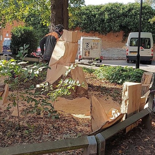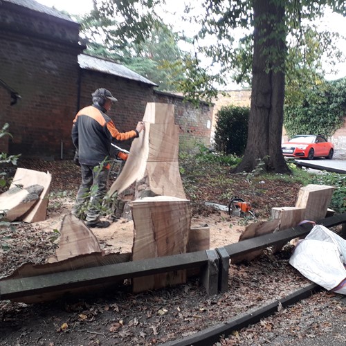 The winter of 2020 brought much wet and windy weather to Cheshire and in late February a storm brought down a large old Beech tree in Castle Park. The park maintenance team moved quickly to make the area safe and, as I observed them cutting the trunk into manageable pieces, it occurred to me that one of the lengths might make a great piece of sculpture. Andy James, the Park Manager, agreed and the Contractor was persuaded to drop the piece off near to the Arts Centre with a Hiab lift.
